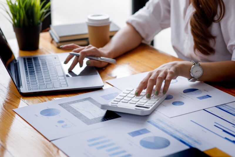 Žena za radnim stolom analizira dokumente i koristi laptop i kalkulator, simbol elektronskog poslovanja i finansijskih obaveza malih firmi u Srbiji