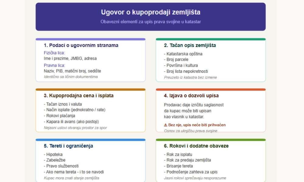 U dokumentu moraju biti navedeni tačna oznaka parcele iz katastra, površina, kupoprodajna cena i način isplate, kao i izjava prodavca kojom se dozvoljava upis prava svojine.